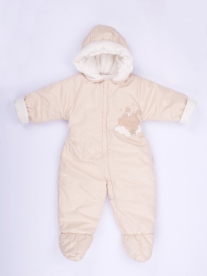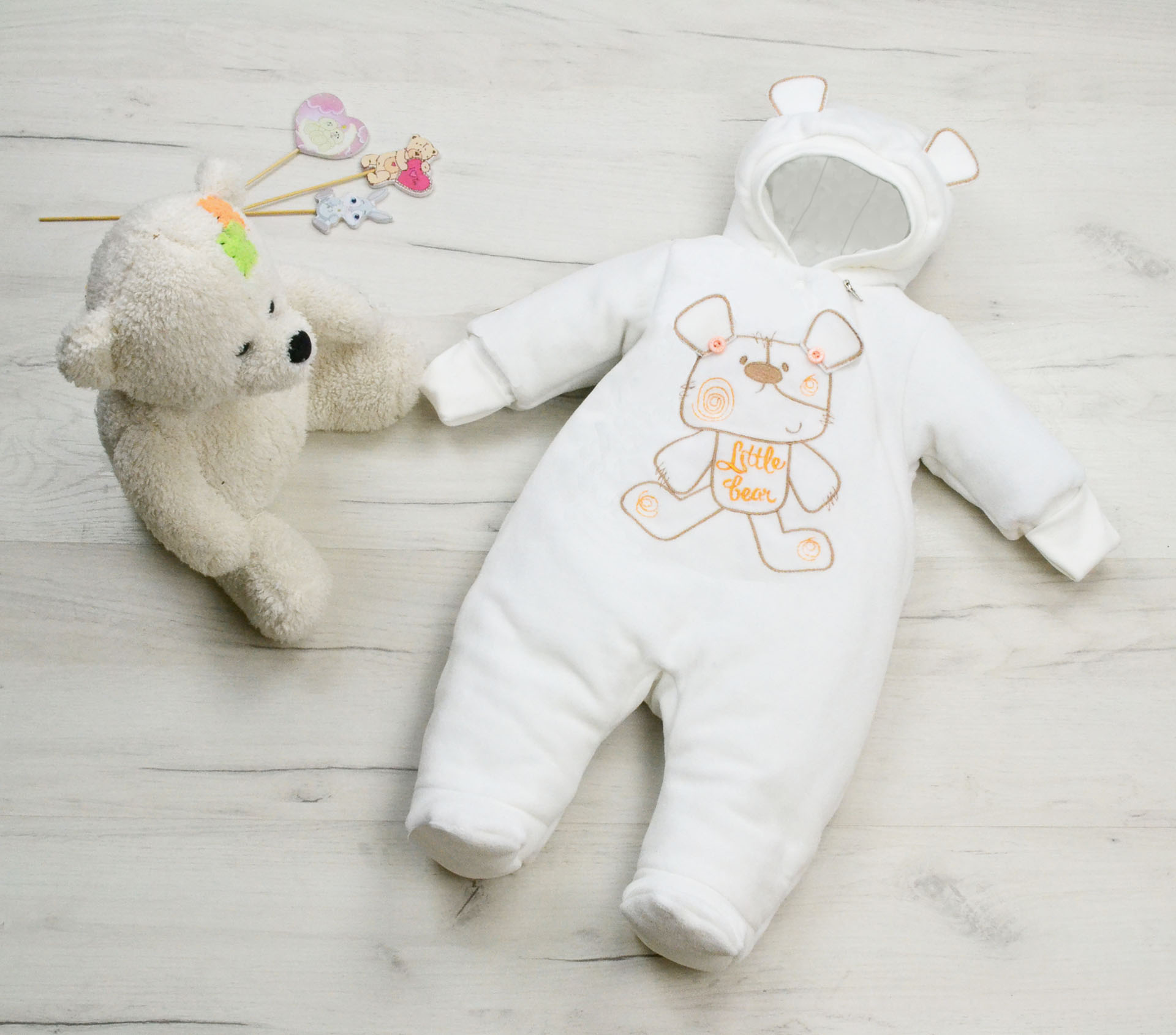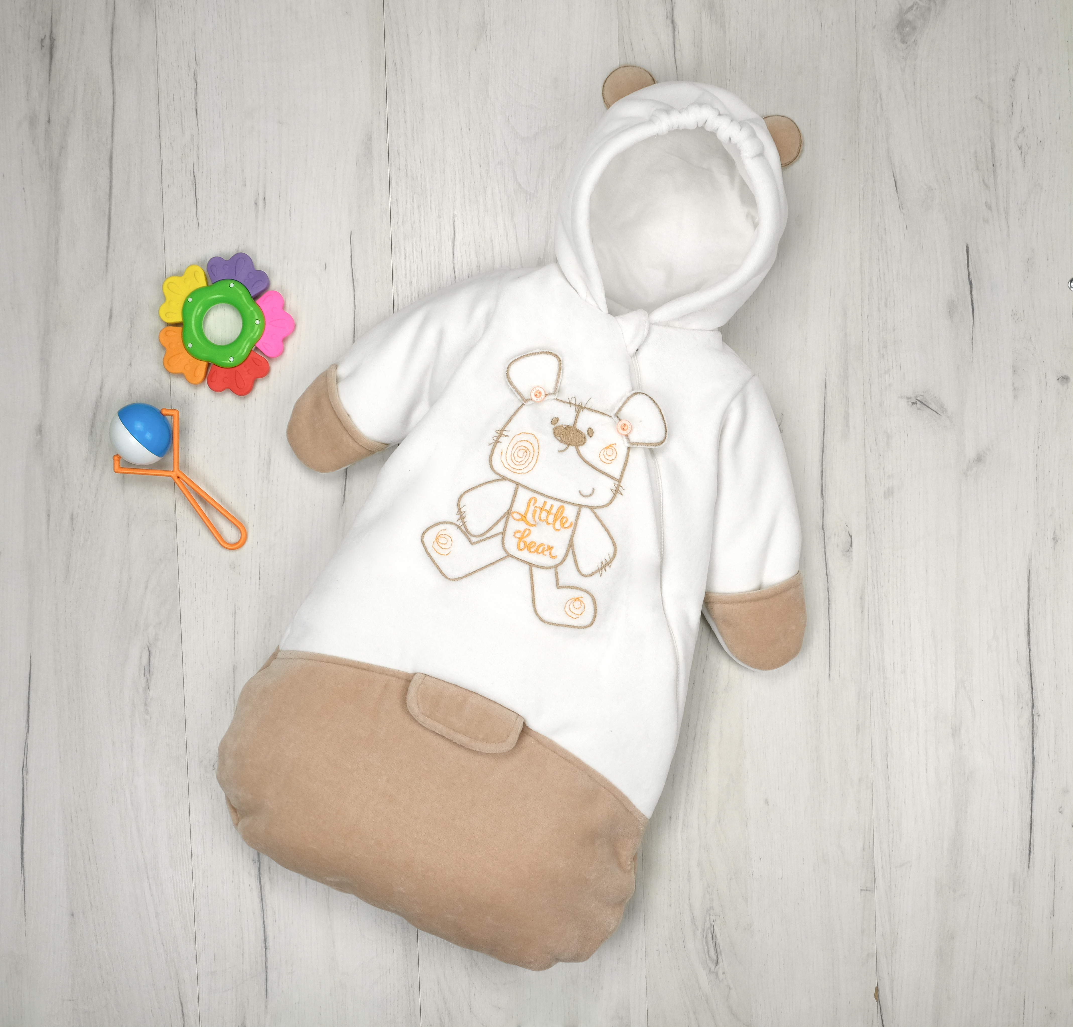 Уютный, теплый комбинезон-конверт из велюра на синтепоне 100 грамм и на кулирной подкладке (100% хб). Рукава комбинезона с отворачивающимися рукавичками, по рукавичкам проложены строчки, имитирующие коготочки медвежонка. Горловина с капюшоном, в который вшиты ушки-шевроны. Застежка на молнию уходит в боковой шов и в низ - это очень удобно, когда одеваешь ребеночка. Внутри молния закрыта ветрозащитной планкой на синтепоне. Нижняя часть комбинезона отрезная, в ней обработаны карманы - слимы, для пристегивания малыша ремнем безопасности. На полочке - забавная вышивка с ушками и пуговками. КомбинезоныЦвет: экрю верх/бежевый низ