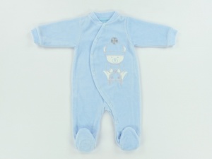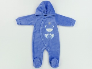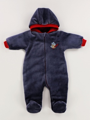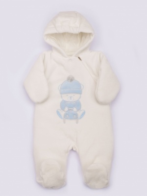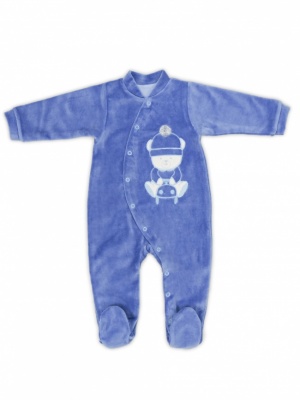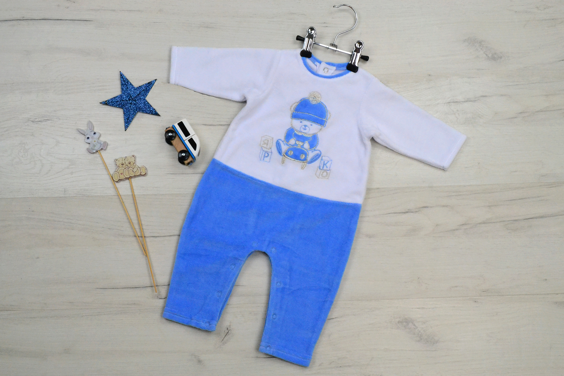 Комбинезон для мальчика из велюра, свободного силуэта. Спинка и полочки разрезные, состоят из верхней и нижней частей. Рукав длинный. Застежка сзади на спинке и в шаговом шве на кнопки. Верхняя часть полочки украшена печатью и стразиком. КомбинезоныЦвет: верх белый/низ тем.голубой, 62 68 74 верх белый/низ св.голубой