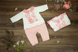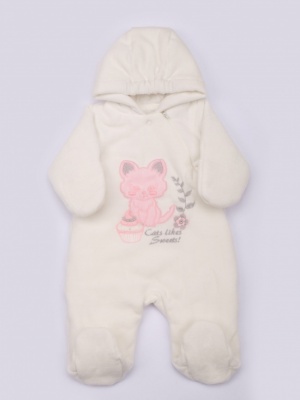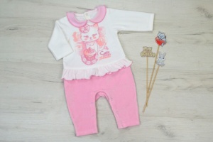 Комбинезон для девочки из велюр, свободного силуэта. Спинка и полочка разрезные, состоят из верхней и нижней частей. В шов соединения деталей полочки и спинки вшита оборка. Рукав длинный. Застежка сзади на спинке на кнопки и в шаговом шве на кнопки. Верхняя часть полочки украшена печатью и стразами. КомбинезоныЦвет: верх экрю/низ розовый