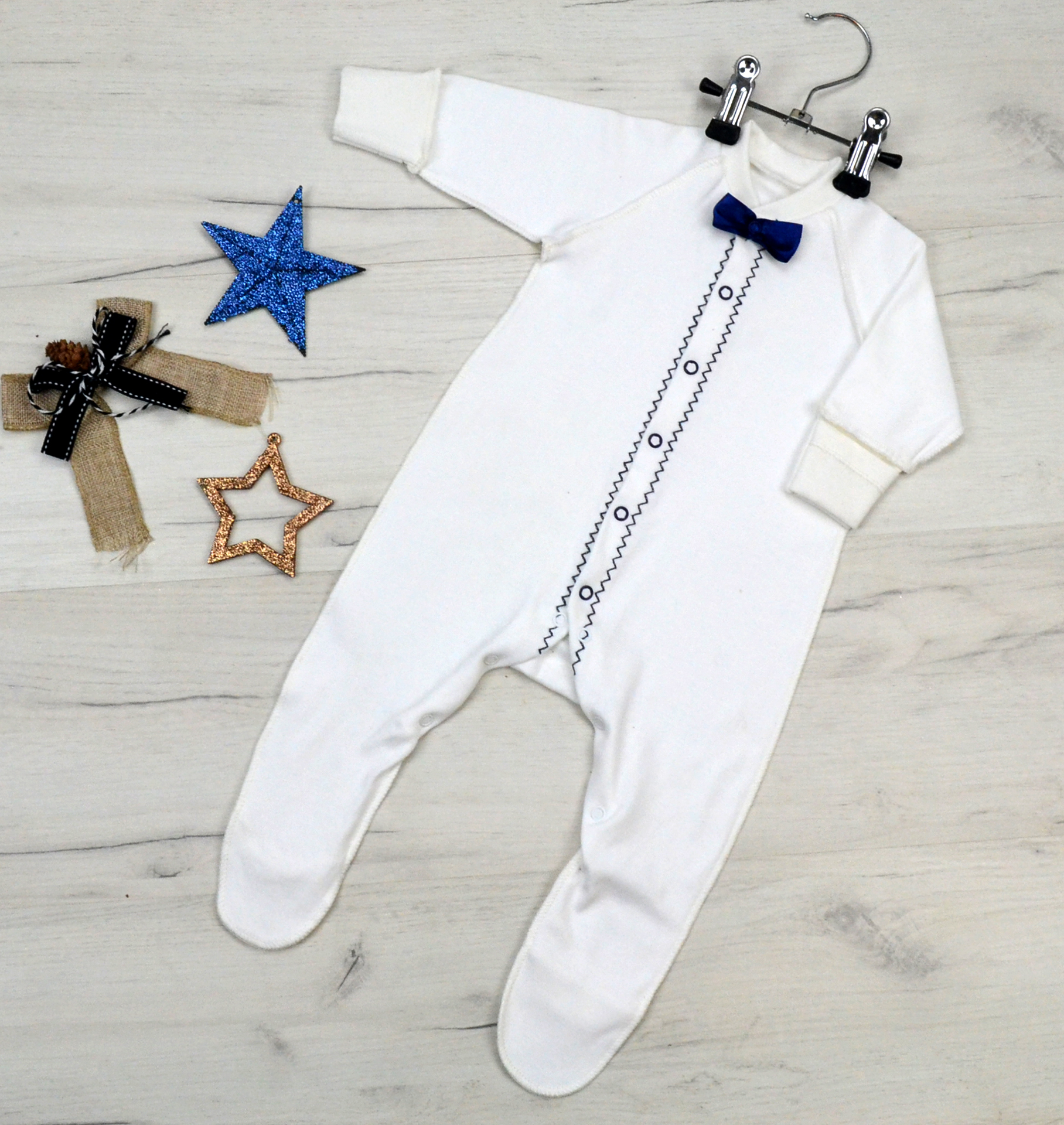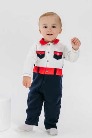 Нарядный комбинезон из интерлока (100% хлопок). Комбинезон в классическом сочетании синего и белого, идеально будет смотреться на Вашей крохе. Съемный галстук-бабочка и небольшая вышивка добавляют элегантности комбинезону. Изделие застегивается на кнопочки - просто и удобно! КомбинезоныЦвет: на фото