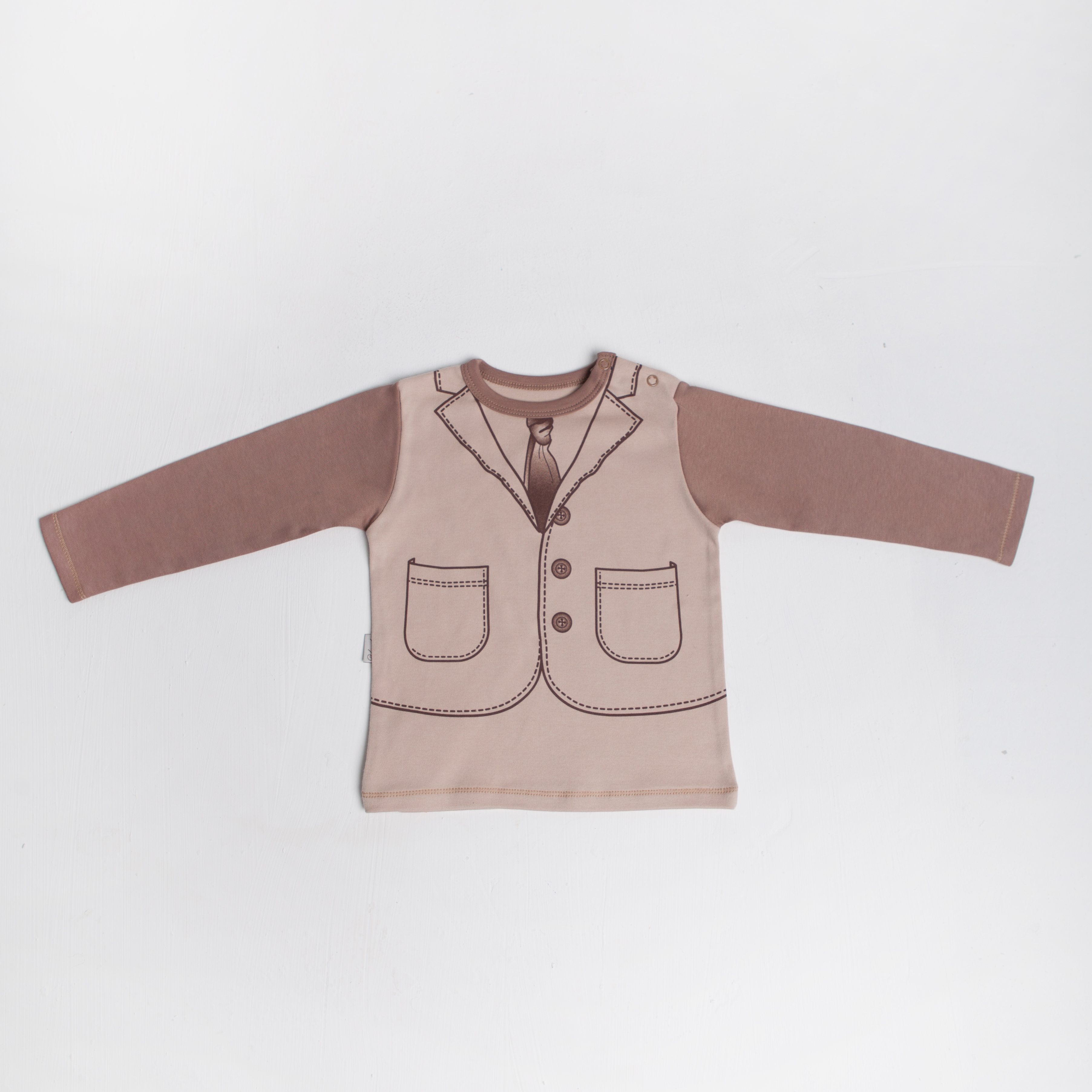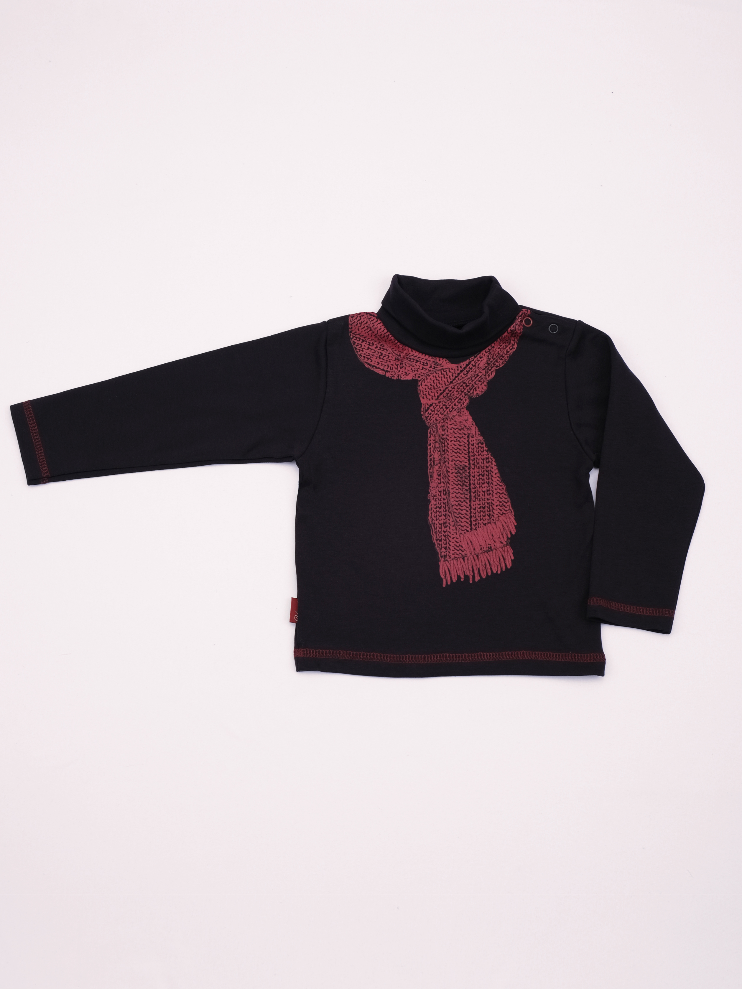 Джемпер из интерлока, застежка в плече на кнопки, украшен печатью имитирующей шарфик.