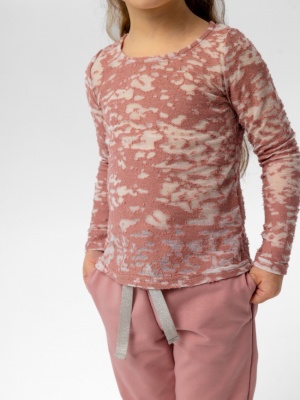 Джемпер из 2-х ниточного футера "деворе". "Деворе" - это эффект изготовления трикотажа, при котором волокна вытравливаются, создавая полупрозрачный рисунок. На нашем изделие рисунком является камуфляж. Джемпер прямого силуэта, без застежек. С помощью джемпера и костюма 05276 ФП можно создать интересный, полноценный образ для девочки. Рекомендуемый режим стирки 30 градусов (без отжима, сушка на плечиках).