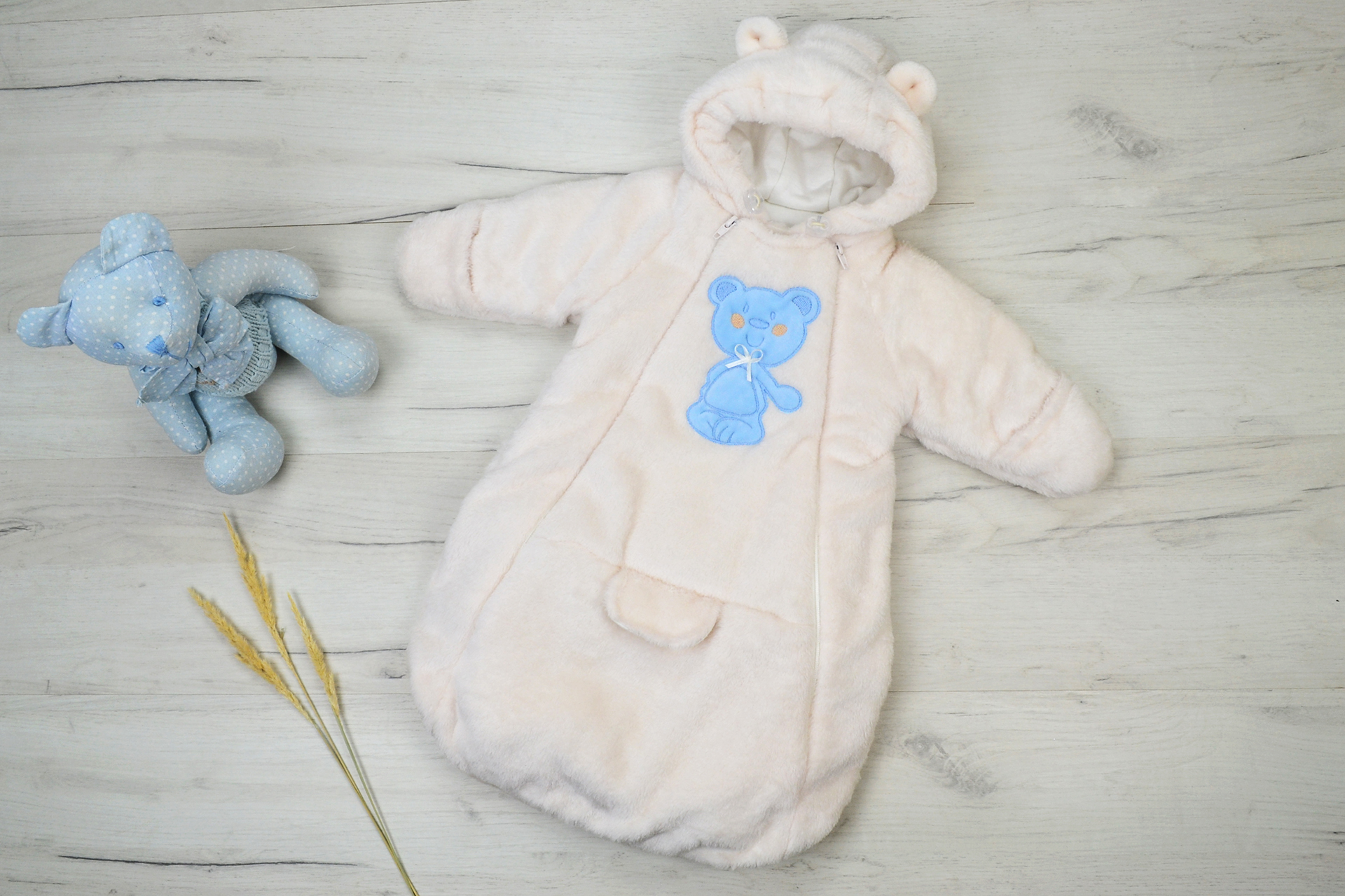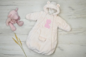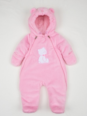 Пушистый, теплый комбинезон-кокон из велсофта. Комбинезон на кулирной подкладке (100% хлопок) и на синтепоне - 100 грамм. Застежка на две молнии - очень удобно положить новорожденного ребенка. Рукава с отворачивающимися рукавичками, чтобы маленькие ручки всегда были в тепле. В подрезах комбинезона обработаны специальные карманы - для пристегивания малышка к автолюльке. Капюшон с кулиской, в которую вставлена шляпная резинка с фиксаторами. Полочка украшена вышивкой и бантиком.