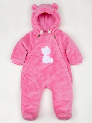 Комбинезон с капюшоном из велсофт на подкладке 100% хлопок утепленный синтепоном 100гр. Комбинезон свободного силуэта. Рукав длинный, заканчивается манжетой. В капюшон вставлена шляпная резинка с фиксаторами. Застежка спереди на 2 молнии. Украшен красивой вышивкой и бантиком.