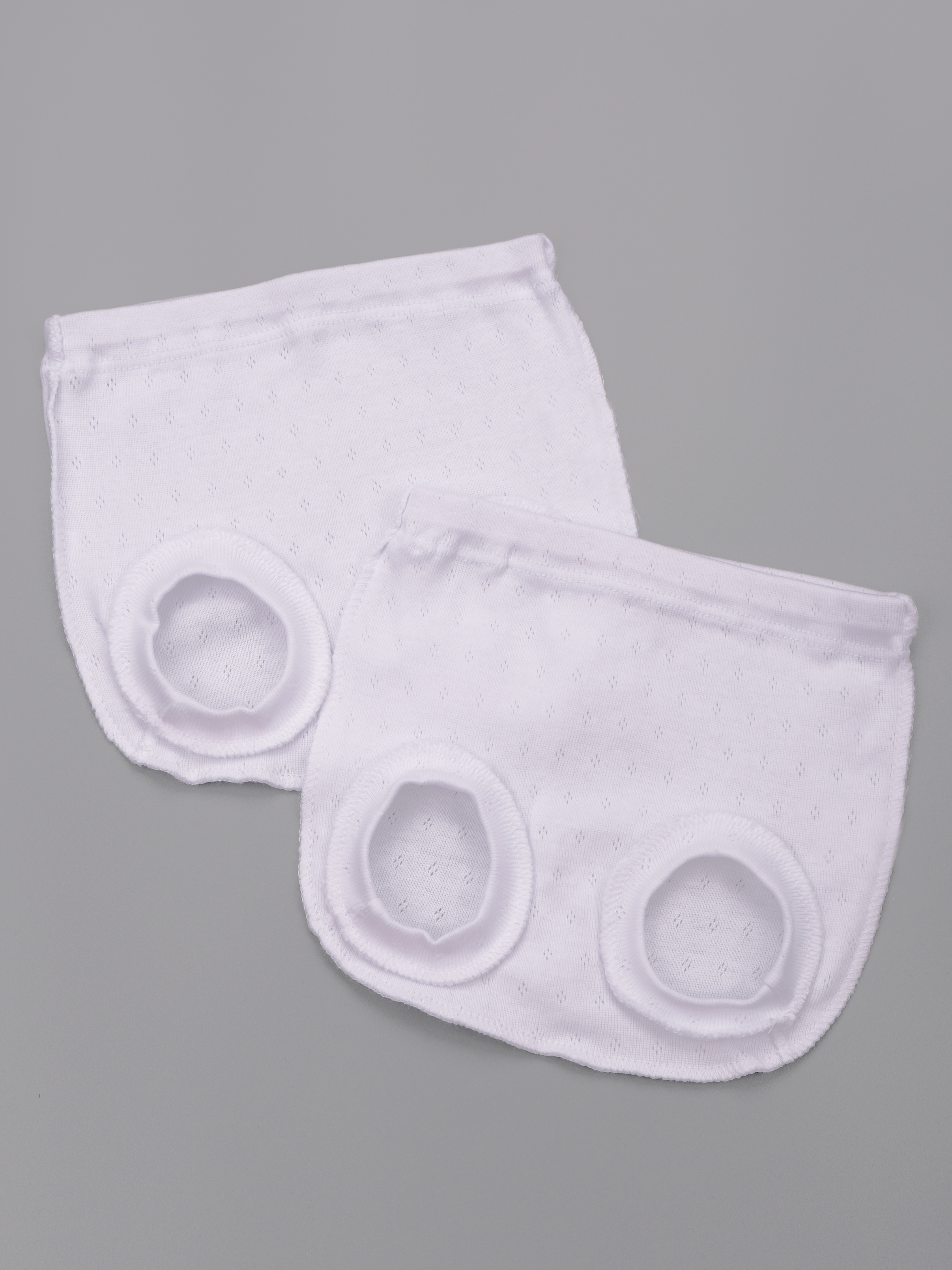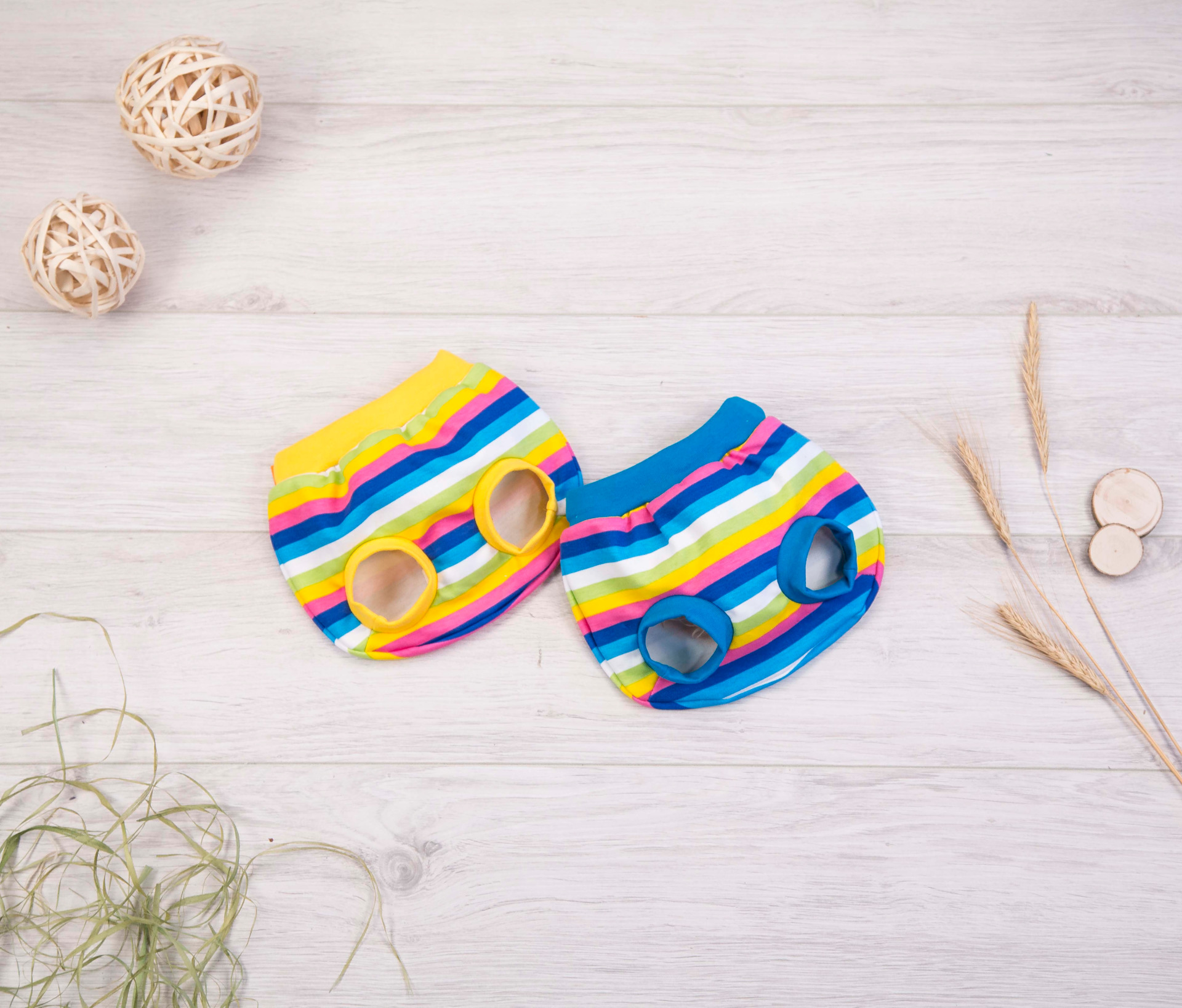 Трусы под памперс из кулирного полотна. На передней половинке выполнены круглые отверстия для ножек, в которых втачаны манжеты. Верхний срез трусов обработан притачным поясом с вложенной резинкой. ДругоеЦвет: полоска/пояс бирюза, полоска/пояс желтый