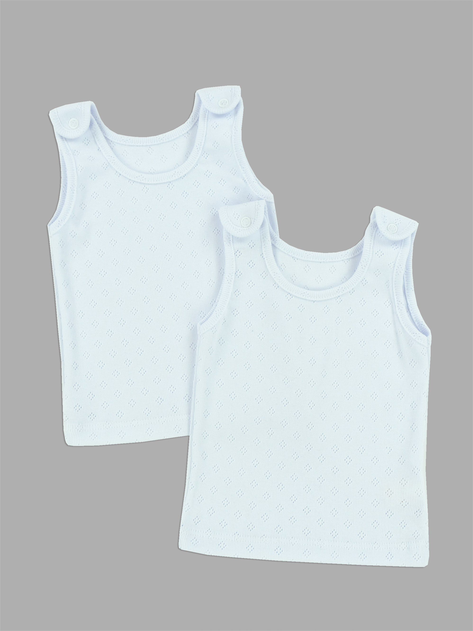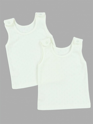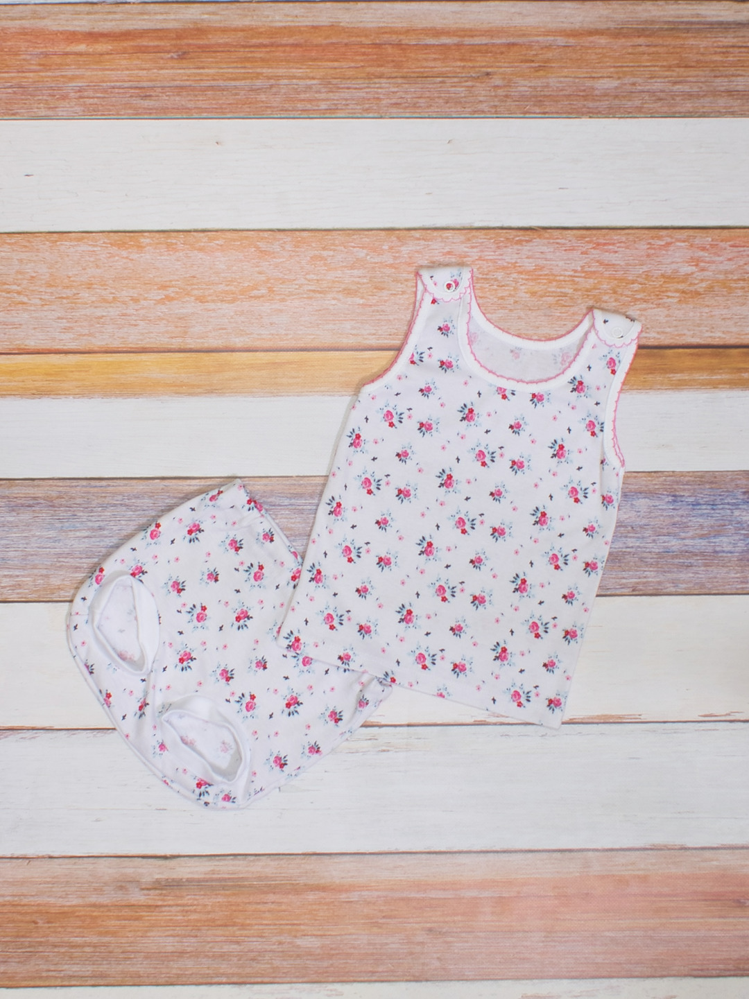 Майка из трикотажного полотна, прямого силуэта. Спинка и полочка цельнокроеные. Проймы переходящие, круглой формы. Горловина и проймы обработаны руликом. По рулику проложен крокет. Низ майки под распошив. Застежка на кнопки по плечам. ДругоеЦвет: розочки на белом