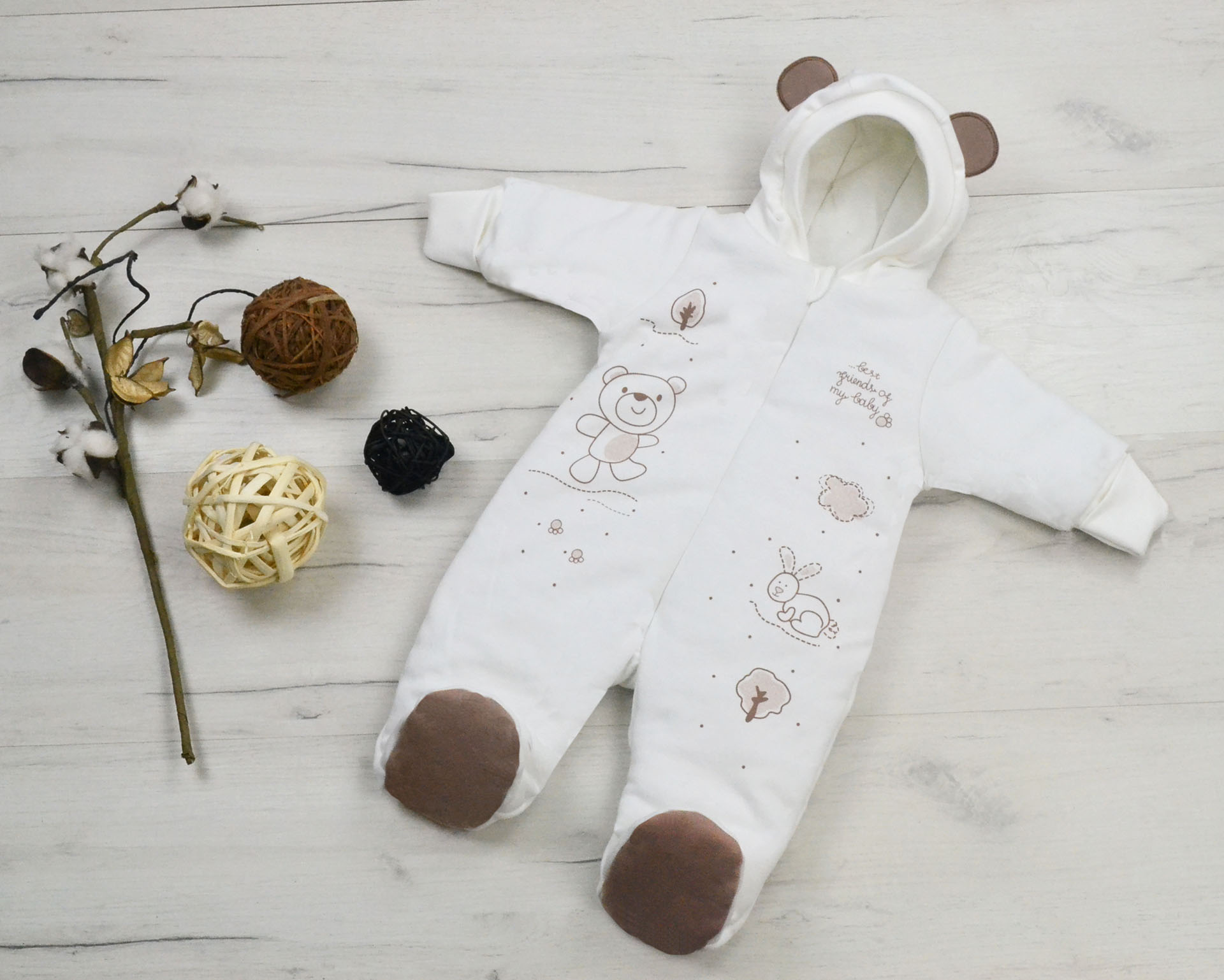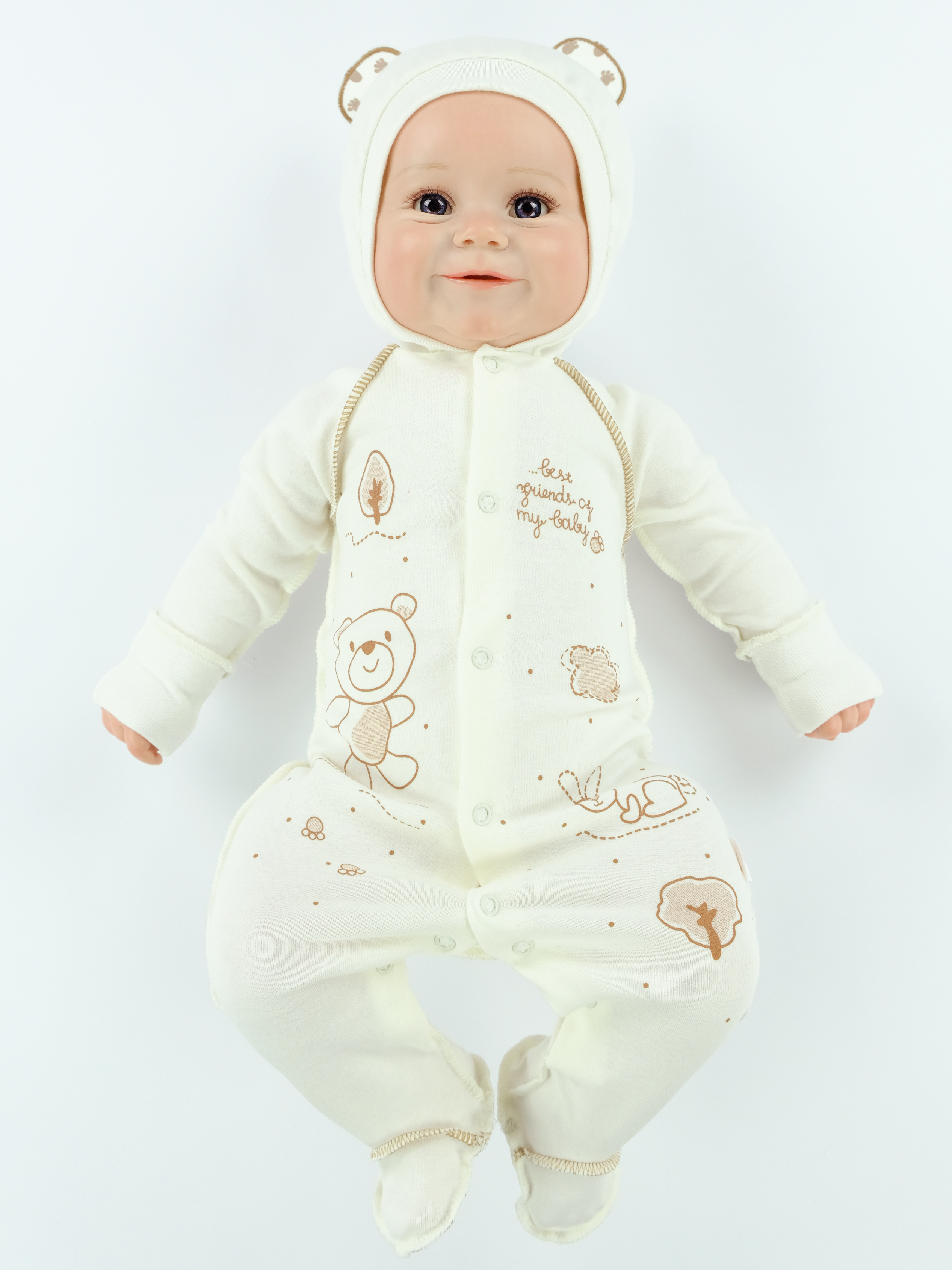 Комплект из интерлока для малышей. Включает в себя: боди, шапочку и комбинезон-конверт. Комбинезон на синтепоне 60 гр и на кулирной подкладке. Застегивается на молнию, полочки украшены печатью. Боди и шапочка выполнены швами на лицо, чтобы защитить нежную кожу малыша. В таком комплектике малышу будет тепло и уютно отдыхать. КомплектыЦвет: экрю с печатью