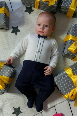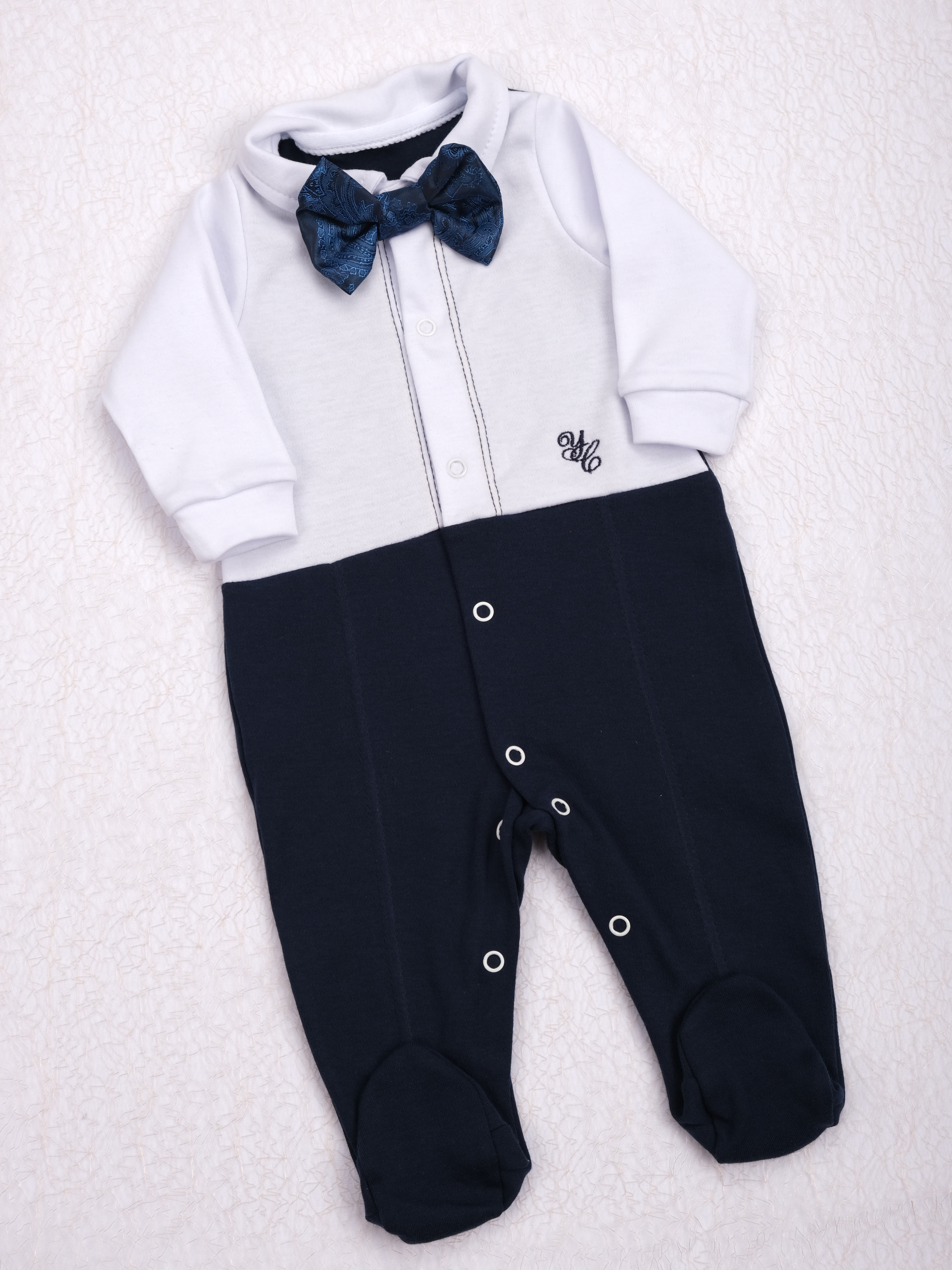 Нарядный комбинезон из интерлока (100% хлопок). Комбинезон в классическом сочетании синего и белого, идеально будет смотреться на Вашей крохе. Съемный галстук-бабочка и небольшая вышивка добавляют элегантности комбинезону. Изделие застегивается на кнопочки - просто и удобно! КомбинезоныЦвет: на фото