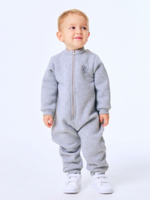 Замечательный комбинезон из интерлока. Горловина обработана окантовкой, на которой стоит кнопка. В левый шов реглана втачана застежка молния. Полочка комбинезона украшена оригинальной печатью. Куртки, комбинезоныЦвет: серый меланж/окантовка василек, синий, красный