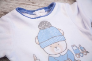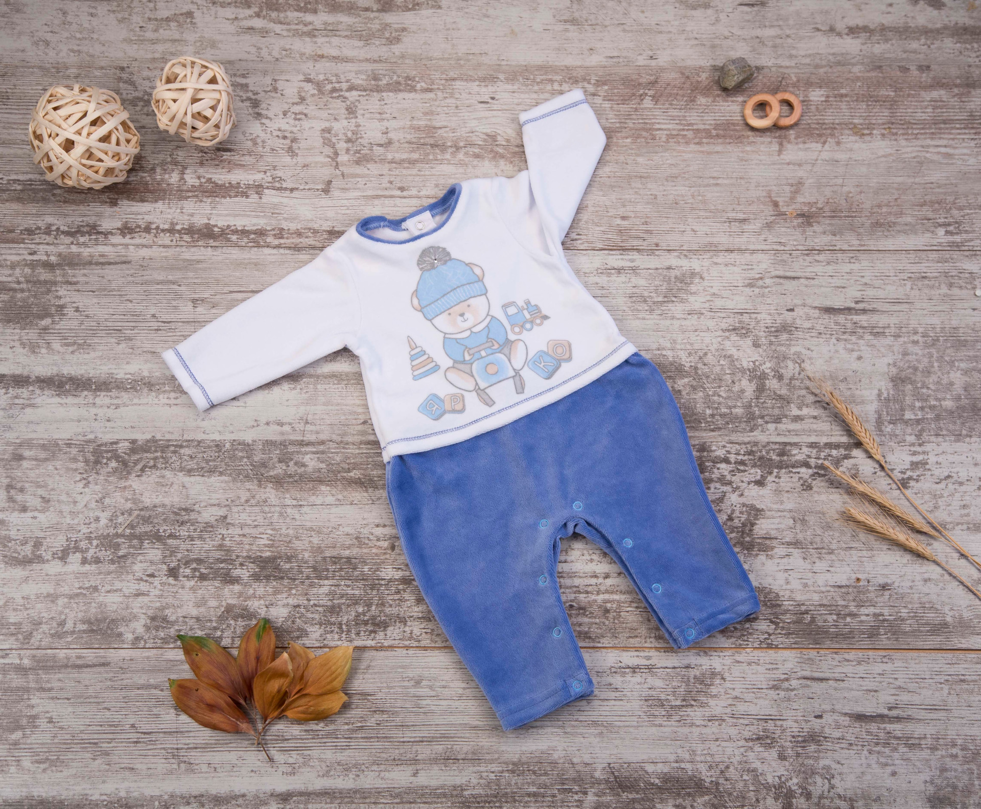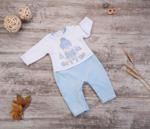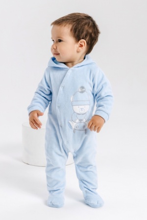 Комбинезон для мальчика из велюра, свободного силуэта. Спинка и полочки разрезные, состоят из верхней и нижней частей. Рукав длинный. Застежка сзади на спинке и в шаговом шве на кнопки. Верхняя часть полочки украшена печатью и стразиком.