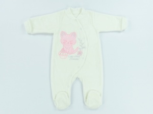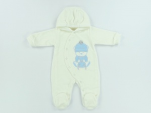 Комбинезон из велюра на кулирной подкладке 100% хлопок, свободного силуэта.Рукав длинный, заканчивается рукавичкой. Горловина оформлена отложным воротником. Застежка спереди на кнопки по борту, переходит в правую ножку. Полочка украшена красивой вышивкой.