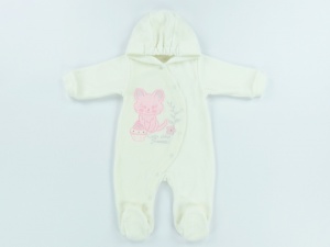 Замечательный комбинезон с капюшоном из велюра на кулирной подкладке - 100% хлопок. Застегивается на кнопочки, украшен вышивкой и стразами.