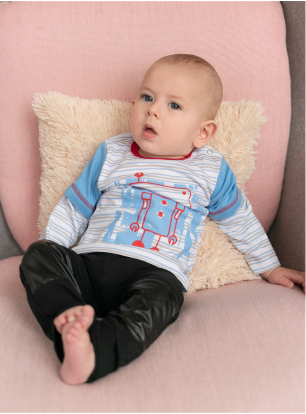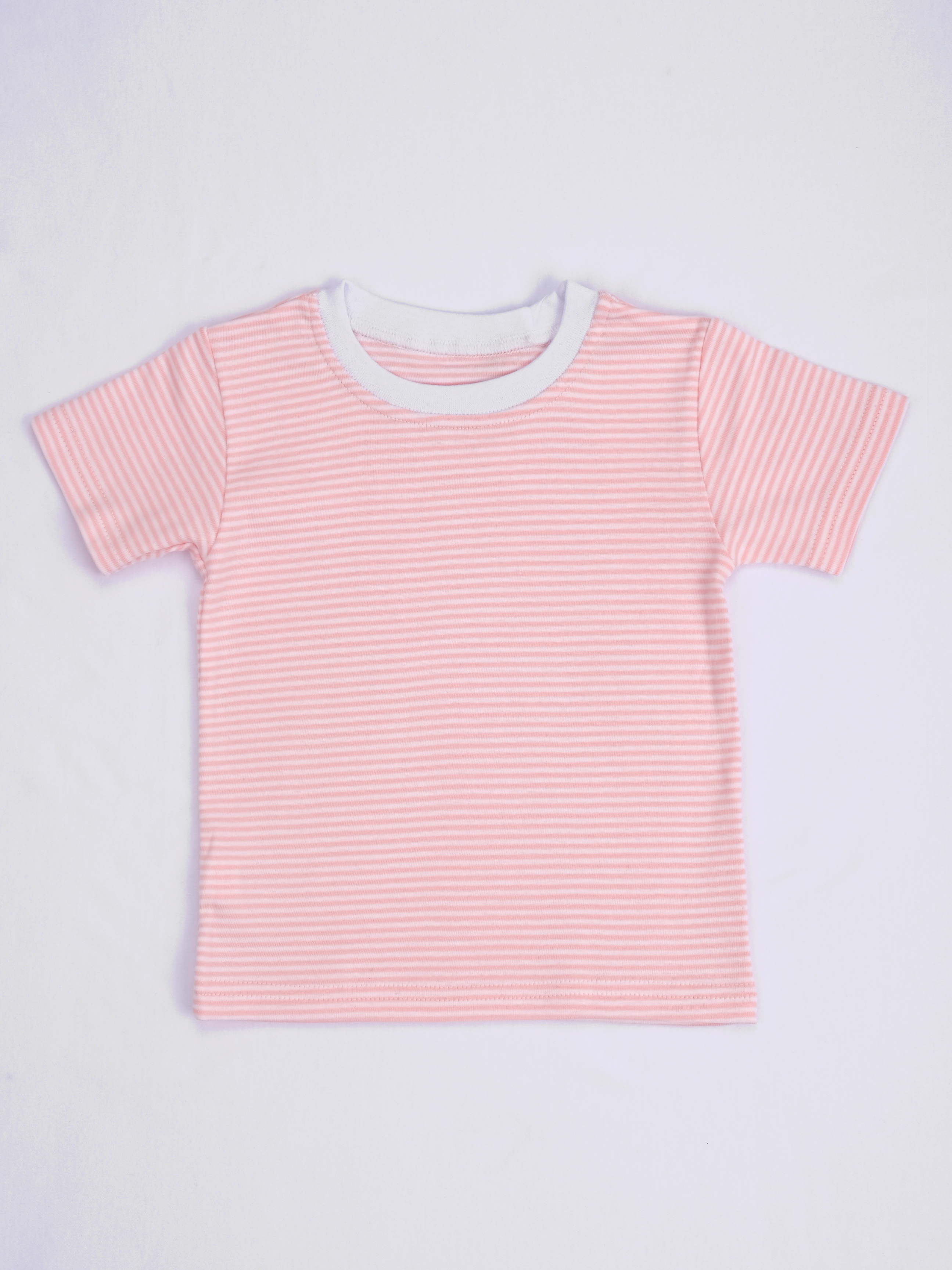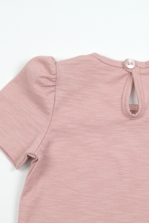 Нежная футболочка детская из плотного трикотажного полотна - рибана 1/1. Футболочка приталенного силуэта, с короткими рукавами. Горловина обработана воротничком, в плече застежка на кнопочки для удобства надевания.