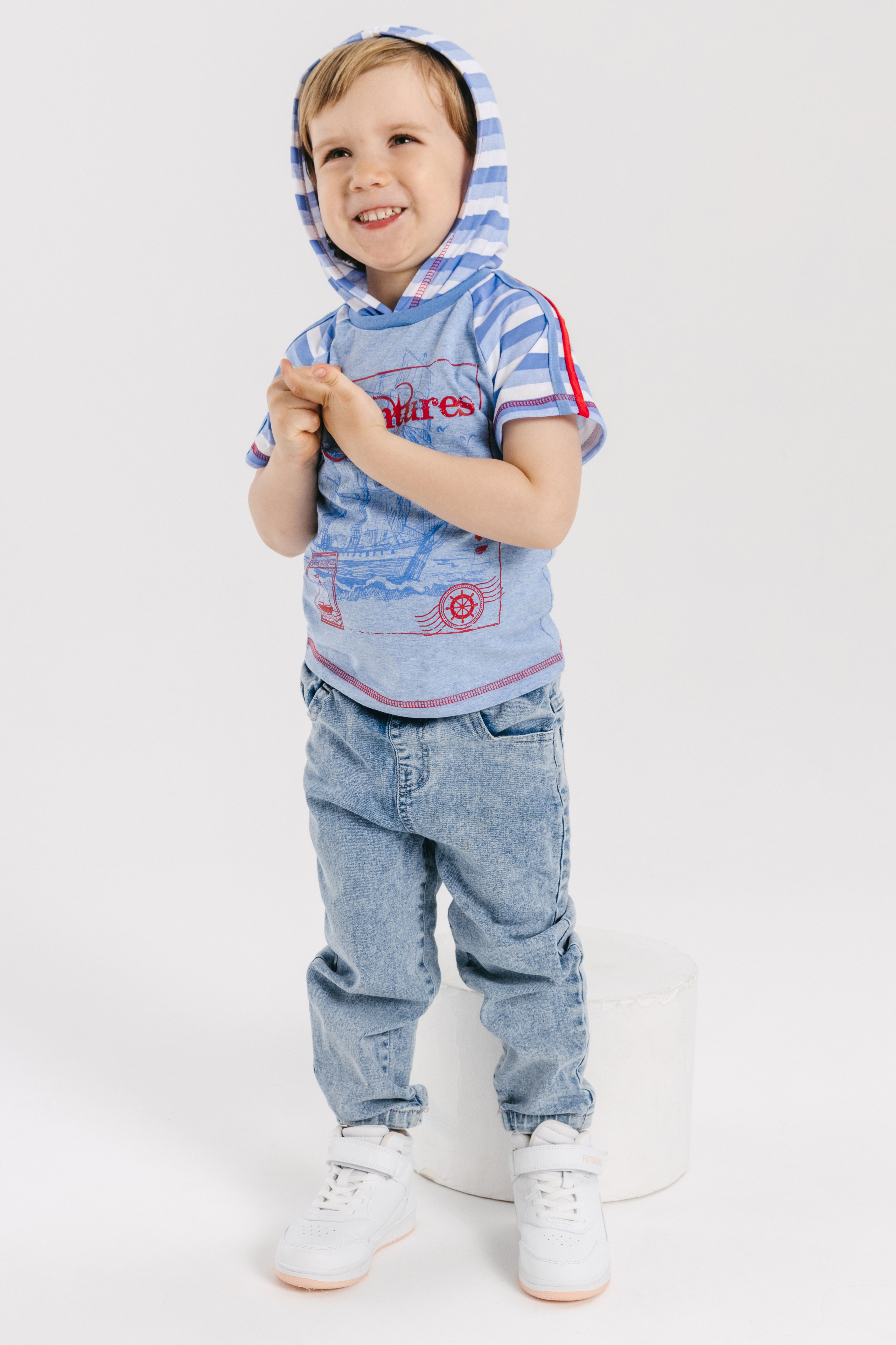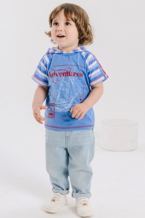 Джемпер с короткими рукавами из кулирного полотна. Полочка украшена печатью, горловина с удобным капюшоном.