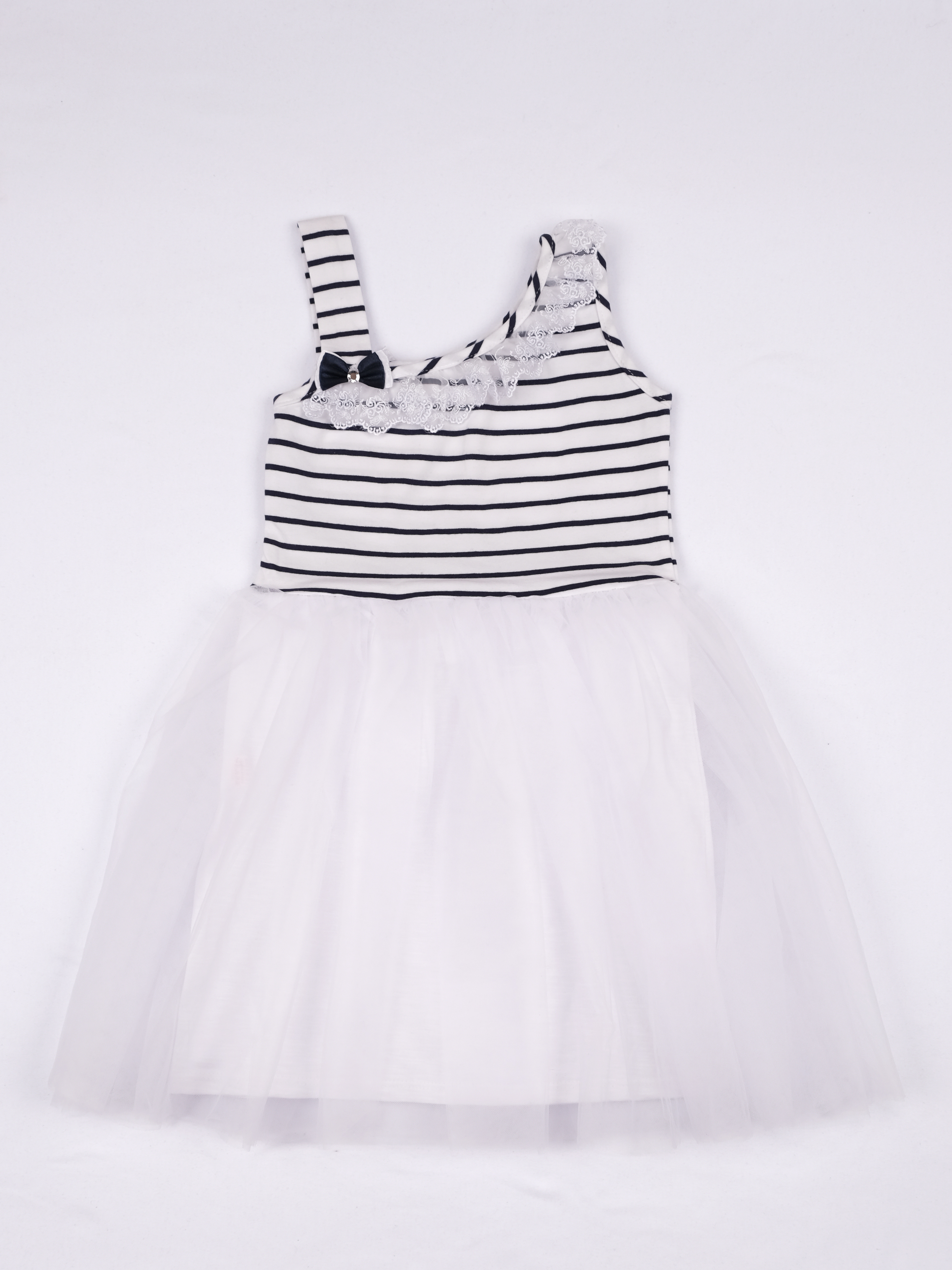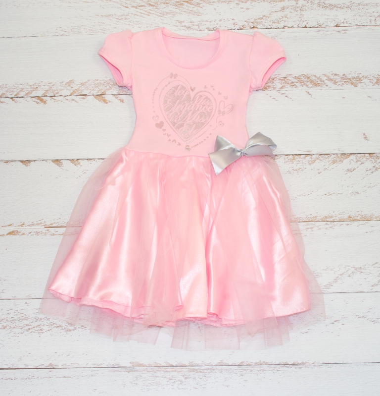 Платье для девочки. Комбинированное из двух видов полотен. Верхняя часть платья из кулирки с лайкрой . Нижняя часть платья состоит из 3-х юбок: нижняя - из слаба 100% хлопок, дина намного короче средней юбки. Средняя юбка - из атласа, верхняя - из фатина - 2 слоя. Общая длина платья - до начала колена. Рукав втачной короткий со сборкой. Шов соединения верхней части платья с нижней украшен красивым атласным бантом. полочка украшена печатью.